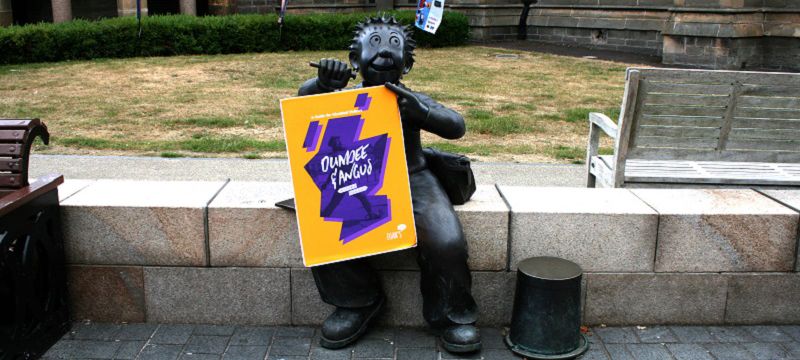 Oor Wullie statue in Dundee holding the Euan's Guide Dundee and Angus travel guide.
