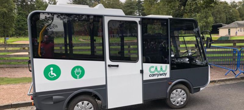 Image of an accessible vehicle for assisting wheelchair users to get around a large outdoor event.