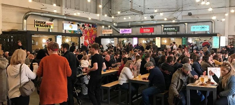 Photo of street food stalls and crowd seating, eating and chatting at Baltic Market.