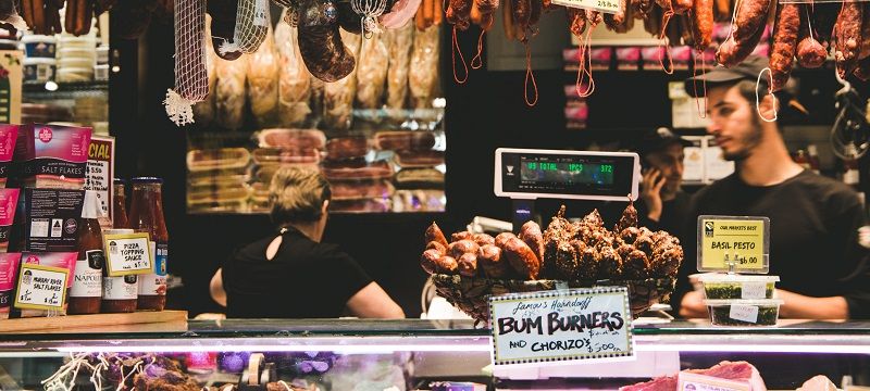 Photo of dried meats shop in a market with sausages and chorizo hanging on top of till and counter.